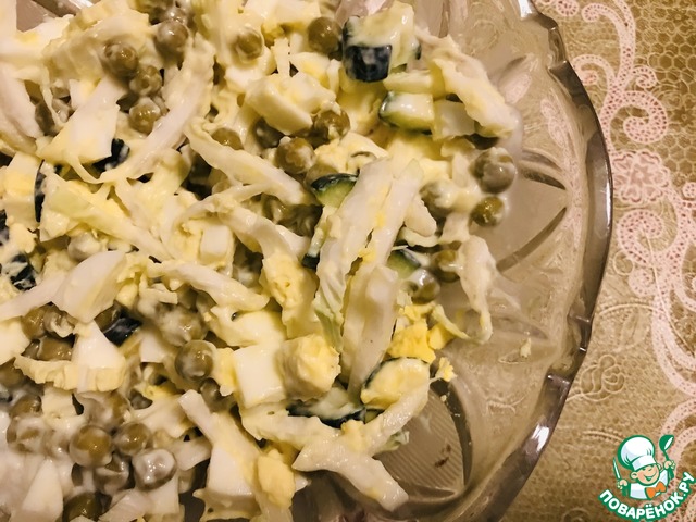 • Добавить зеленый горошек, все перемешать, посолить и заправить или майонезом или заправкой: растительное масло 2,5 ст.л. смешать с 1 ч.л. горчицы.