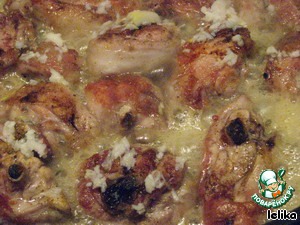 Курочка румяная с обеих сторон, но еще не доведенная до кондиции. Для этого нам нужна наша чесночная водица, которая постояла, но не остыла.