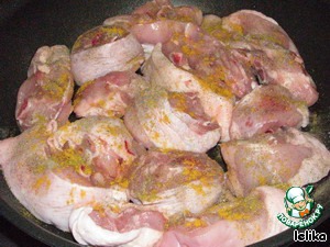 На разогретую сковороду, политую растительным маслом и посоленную (не удивляйтесь, я всегда так делаю, курица получается в меру соленая), выкладываем наши кусочки курицы и посыпаем специями.