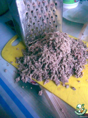 Печень натереть на терке крупной. Можно и кубиками порезать. Но для формирования початков масса должна быть клейкой. -