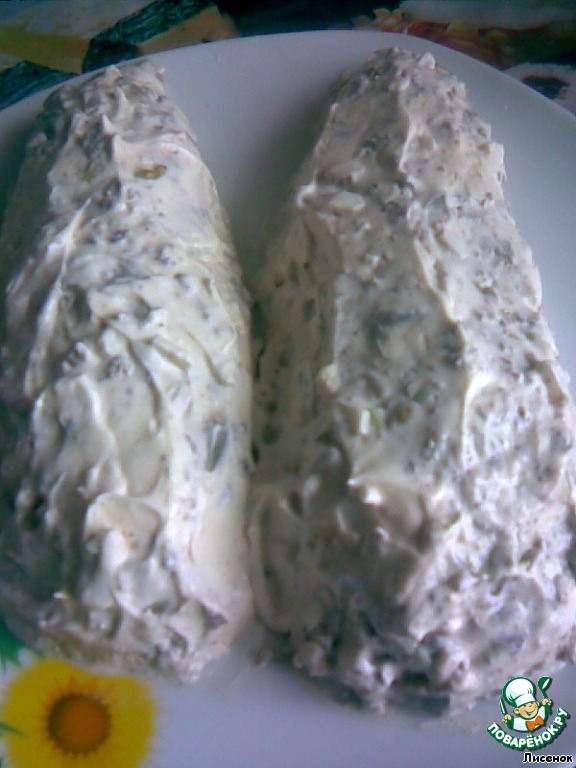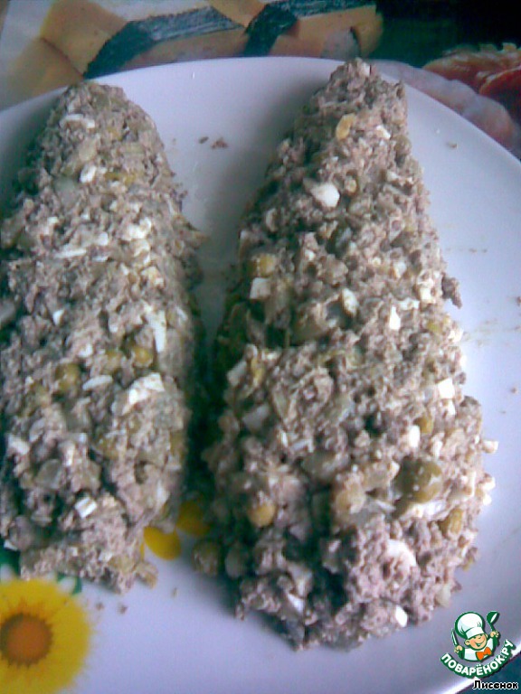 Там салат был привычный всем "Мимоза". Только последовательность слоев другая. Не хротелось повторяться. А руки уже чесались сделать эти "початки".