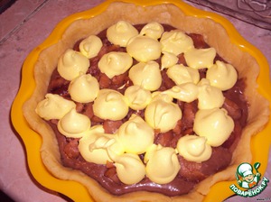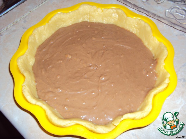 Пока эта масса остывает, вынуть песочное тесто из холодильника, размять в смазанной форме так, чтобы края заходили на борта.