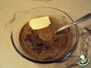 Теперь в остывшую шоколадную массу добавить 1 яйцо, 3/4 стакана муки, разрыхлитель ( 1ч.л.без горки), хорошо перемешать и выложить это тесто в форму с песочным белым тестом.