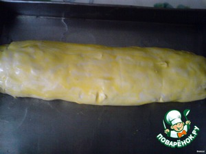 Свернуть в рулет (не туго, а то при выпекании может лопнуть)