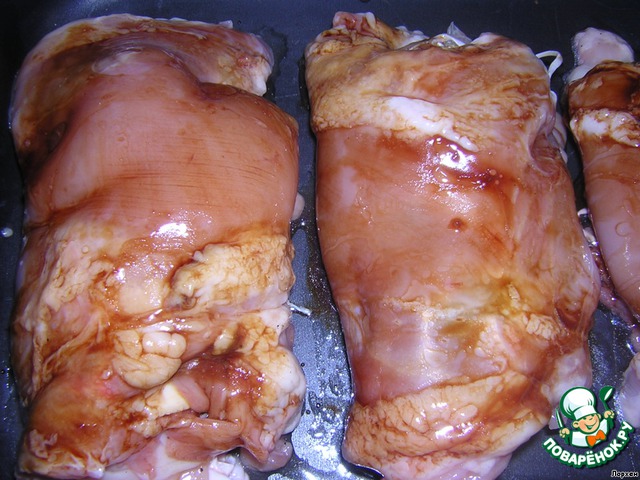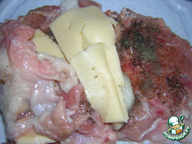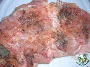 Окорочок освобождаем от кожи и костей, посыпаем солью, специями, черным перцем, базиликом.