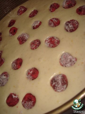 Сверху выкладываем вишню, обвалянную в крахмале. Вишня потом утонет.