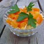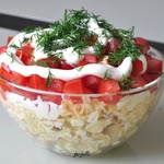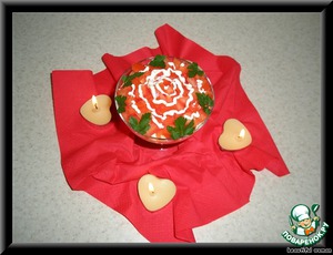 Оле-оле-оле-оле - "Динамо"-чемпион! "Наши выиграли! Скажи, хорошо? Есть что-нибудь вкусненькое пожевать?"-донесся из зала довольный голос мужа. К сожалению, на этой фразе все хорошее для меня закончилось. Что-нибудь...? Вот это мило! А тот факт, что за время просмотра футбольного матча было стерто с лица земли, заботливо мной приготовленных: четыре увесистых бутерброда с колбасой и сыром, упаковку соленых орешков, пакет вяленой рыбки и литр пива - намеренно замалчивался! Ну, конечно - это просто так - разминка, легкая пробежка перед стартом! Марафон еще впереди!... Вот взять бы самому оторваться от любимого дивана и приготовить жене на радость "Фрикасе из кролика в винном соусе"! Вот это был бы праздник!!! Но это так - лирическое отступление. "Чего бы тебе хотелось, милый?" - спросила я с неподдельным интересом, хотя сама так бы и треснула его половником по башке! "Ну-у-у... только не борщ, не кашу и не котлеты. Придумай что-нибудь" - ответил муж. Понятное дело, не борщ, не кашу и не котлеты, которые были съедены моим благоверным еще до начала матча. И съедеными не считаются. Ладно, буду думать, в первый раз что ли... И придумала... Салат "Каприз моего любимого".