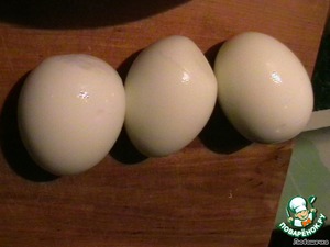 • Когда основа салата остынет, режем вареные куриные яйца кубиками, добавляем в рис с мясом