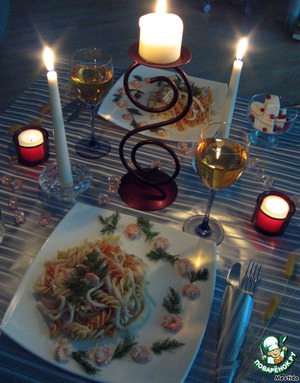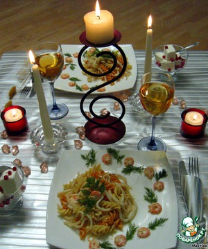 Это блюдо просто идеально для романтического ужина... оно так просто готовится, но получается очень нежным.. сочным.. ярким лакомством.. морепродукты, чили.. - признанные афродизиаки, но обращать на это внимание любимого не стоит, ведь не известно, может он решит, что Вы сомневаетесь в его мужской силе.. пусть это останется нашей маленькой ЖЕНСКОЙ ТАЙНОЙ.. Ваша вторая половина, непременно, останется довольна.. и подарит Вам не только замечательный вечер.. на конкурс "Подари мне этот вечер"