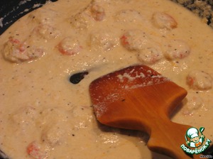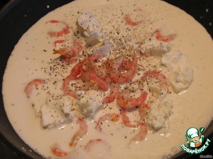 в сковородку выливаем сливки, сыр "Фета", очищенные креветки, приправляем перцем и готовим, пока сыр не растворится -