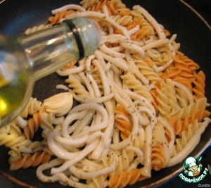 На сковородку выкладываем следка раздавленные плоской стороной ножа зубчики чеснока, макаронные изделия, кальмаро-макароны, приправляем оливковым маслом, солью, перцем, лимонным соком и специями