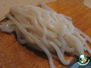 Кальмары нужно нарезать тоненькими полосочками
