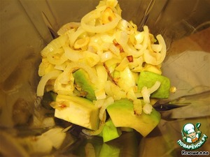 • В чашу блендера кладем очищенный и порезанный кусочками авокадо, добавляем лук и чеснок. Вливаем кипяченую воду и измельчаем до консистенции пюре.