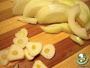 • Пока жарится рыба, приготовим соус. Для этого лук нарезаем тонкими полукольцами, а чеснок - пластинками.