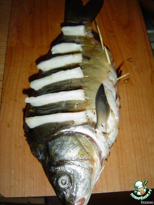Карпа укладываем на противень, смазанный растительным маслом, и отправляем в духовку, нагретую до 160 гр. И запекаем в течение 40 минут. Удаляем зубочистки.