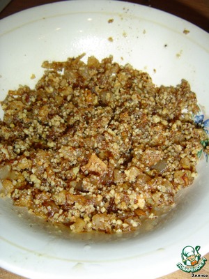 На разогретую сковороду выкладываем сало и обжариваем, при этом выделяется жир, на котором мы обжариваем лук до мягкости. К луку и выжаркам добавляем орехи и жарим все вместе еще 3 минуты.