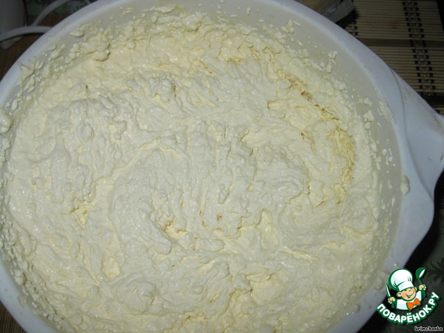 Белки взбить с сахаром в пену, осторожно вмешать в творожную массу -