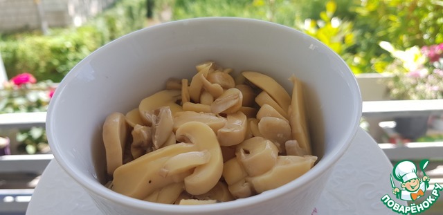 затем высыпаем грибы, варим (шампиньоны - 30 минут, вешенки - 20 минут).