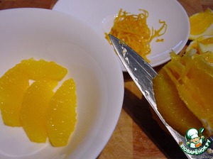 Факультативный апельсиновый салат: апельсины вымыть горячей водой, с одного апельсина снять цедру. Апельсины очистить и вырезать мякоть дольками.