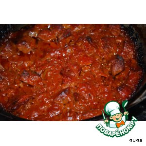 Достаем форму, вливаем вино, бульон и томатную пасту. Опять хорошо перемешиваем, закрываем крышкой и ставим в нижнее отделение духовки томиться на 2,5 часа.