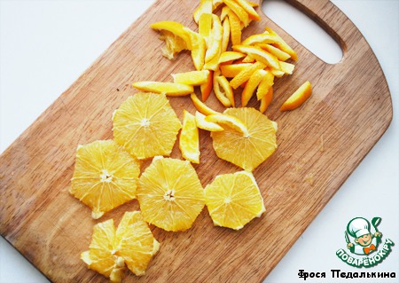 Апельсин нарезать кружками, срезать корочки, поделить кружки на 4 части.