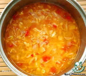 Добавить томаты и стекший с них сок, бульон и тушить 10 минут. Посолить, поперчить по вкусу.