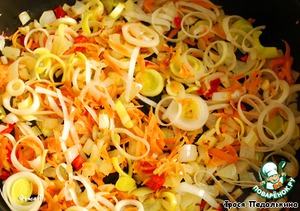 Добавить морковь, сельдерей, лук-порей, чили и тушить 4 минуты.