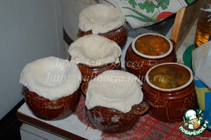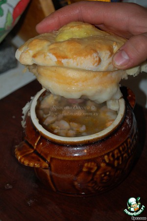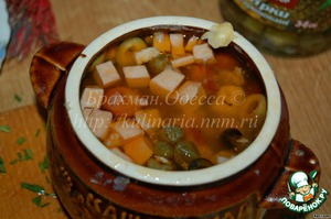 Заливаем бульон с содержанием по горшкам. Добавляем огурцы, каперсы, маслины, оливки. Солим, перчим.
