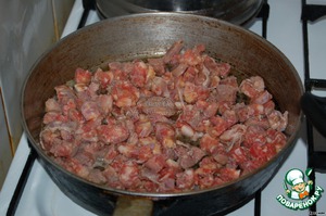 Добавляем томатную пасту, около стакана бульона. Готовим на медленном огне минут 10.