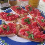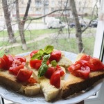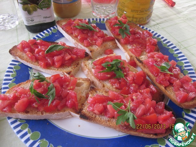 Помидоры очищаем от кожицы, мелко режем, сок сливаем. Чеснок режем очень мелко и добавляем к помидорам, туда же соль, перец, оливковое масло и мелко порезанные листья базилика. Все смешиваем, раскладываем на гренки и подаем.