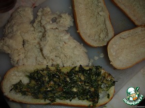 • Булочки разрезать вдоль, вынуть мякоть, наполнить фаршем.