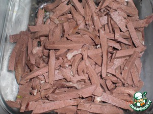 Отваренное в солёной воде сердце порезать мелкой соломкой или потереть на крупной тёрке.