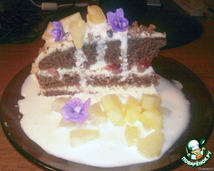 Это шоколадный торт со сливочным кремом, ананасами и помадкой из мороженого. По идее, сливки должны были стать домашним маслом!!! Но взбились в отличный крем для торта. (Наш торт так и получился. )