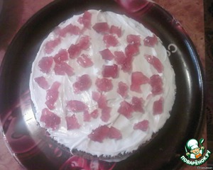 Смазываем коржи и режем на кусочки застывшее желе. Посыпаем поверх крема на каждый корж.