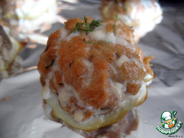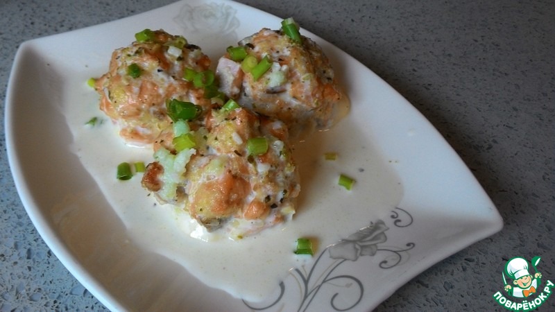 Противень застелить фольгой и вылепить небольшие котлетки или тефтельки (буше по-гламурному) из рыбной массы. -