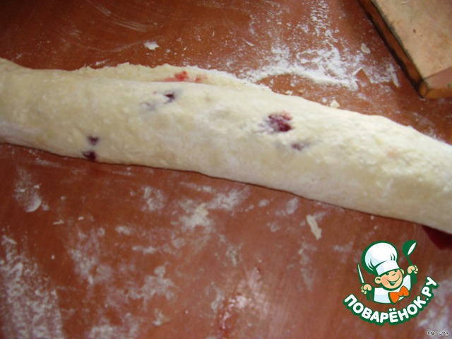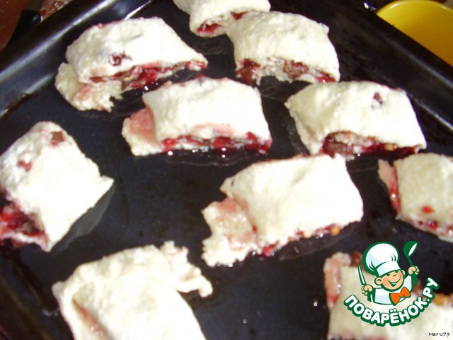 • Разрежьте на кусочки шириной 3-5 см. Аккуратно разложите на противень, который лучше смочить холодной водой, и выпекайте 10-15 минут при температуре 200°С. Готовое печенье можно посыпать сахарной пудрой.