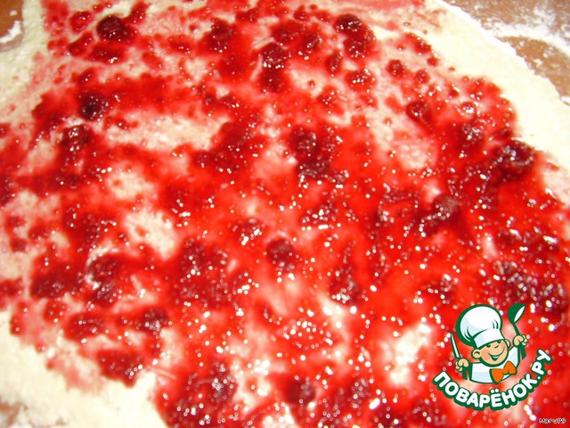 • Тесто нужно смазать любым вареньем, лучше с ягодой (хотя можно и вареным сгущенным молоком).