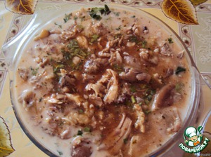 Дальше выложить ещё одну часть мяса, залить стаканом бульона, смешанным с майонезом. Снова на холод.