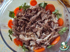 Готовую свинину расщипать, ножки разобрать, освободить от мосоликов.