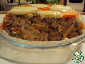 Теперь выкладываем 1/3 часть смешанного мяса на морковку и яйца. Заливаем стаканом прозрачного бульона. Да, забыла написать, когда желатин разбухнет, нагреть бульон до полного растворения желатина (но не кипятить), влить ещё 2 стакана бульона, перемешать.