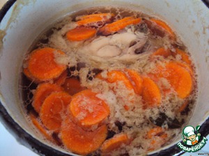 Отварить куриное бёдрышко и морковь, нарезанную кружочками, также с лавровым листом в подсоленной воде.
