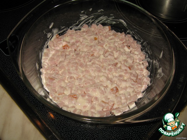 тем временем режем ветчину на мелкие кусочки, перемешиваем ее с майонезом и укладываем первый слой. -