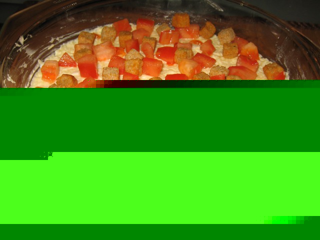 Нарезаем кубиками помидор и посыпаем сверху, также посыпаем сверху сухариками.