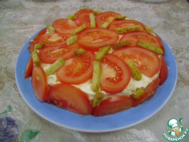 Этот салатик как-то приготовила моя подруга мне на ДР, он настолько простой и настолько вкусный, что теперь у нас он делается постоянно, не говоря уже про праздники. Попробуйте, и вы не останетесь к нему равнодушным. Мы его называем слоеный или сухарный. =)))