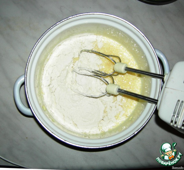 Добавляем муку и соль. Вымешиваем сначала вручную, далее-миксером до полного исчезновения комочков.
