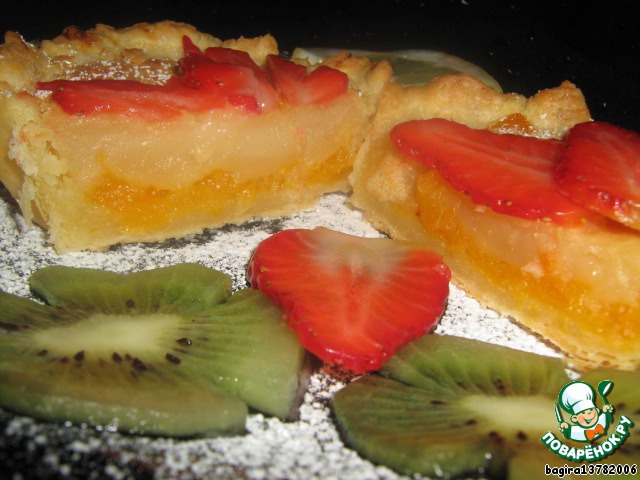 • На дно формы с тестом кладем пюре из кураги, а сверху наливаем лимонную начинку.