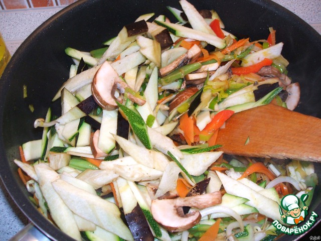 Через 7 мин. добавляем цуккини, баклажан, грибы.