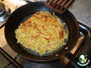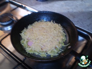 На небольшую сковородку налить растительного масла (без фанатизма), хорошо разогреть и тонким слоем выложить половину натертого картофеля.