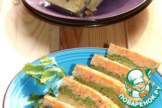 В прямоугольную форму вылить половину теста, сверху выложить начинку. Поверх начинки вторую часть теста.