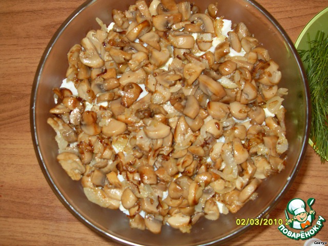 Выложить остывшие грибы с луком на яйцо, это будет 6 слой салатика.